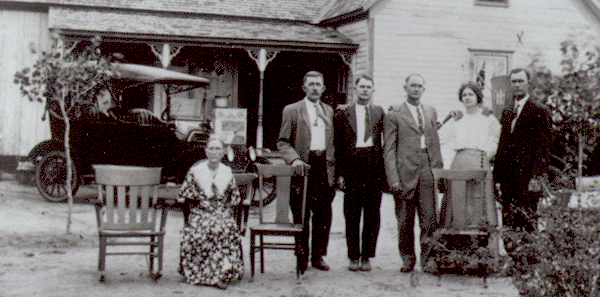 Rogers/Hoggard family gathering near Byars, OK (1)GB and his wife (2)Bessie, (3)Elmer, (4)Effie, (5)Sylvia, (6)Ruby, (7)Nell, (8)Bonnie, and (10)Bertram. |