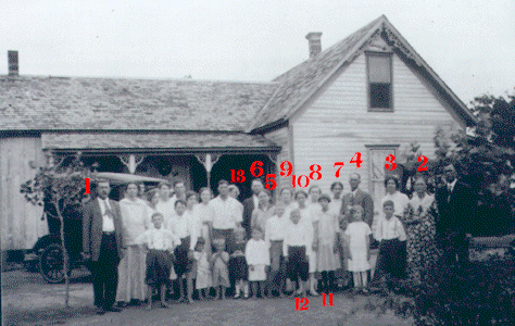 Cynthia with her children, their spouses and her grandchildren (1)John Z, (2)Granny Cynthia, (3)Lillie Dale, (4)GB and his wife (5)Bessie Fremont Rodgers Rogers, (6)Elmer and his new wife (13)Maida Goldman, (7)Effie Mae, (8)Mabel, (9)Sylvia Cordelia, (10)Nellie Inez, (11)Bonnie Blue, and (12)little Bertram. |